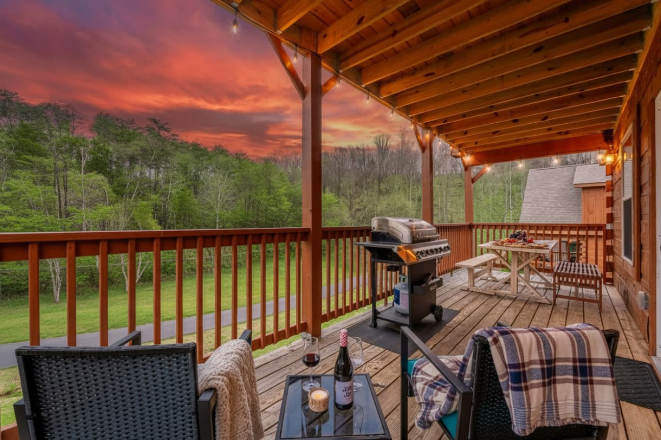 Experience this cabin’s deck: warm flames, golden skies, pure tranquility.